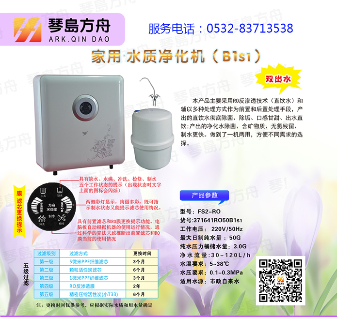 家用·水質(zhì)凈化機(B1s1白色) 雙出水,本產(chǎn)品主要采用RO反滲透技術(shù)(直飲水)和輔以多種處理方式作為前置和后置處理手段,產(chǎn)出的直飲水徹底除菌、除垢、口感甘甜、出水直飲;產(chǎn)出的凈化水除菌、含礦物質(zhì)、無抓殘留、制水更快。做到了一機兩用.方便不同需求的選擇。